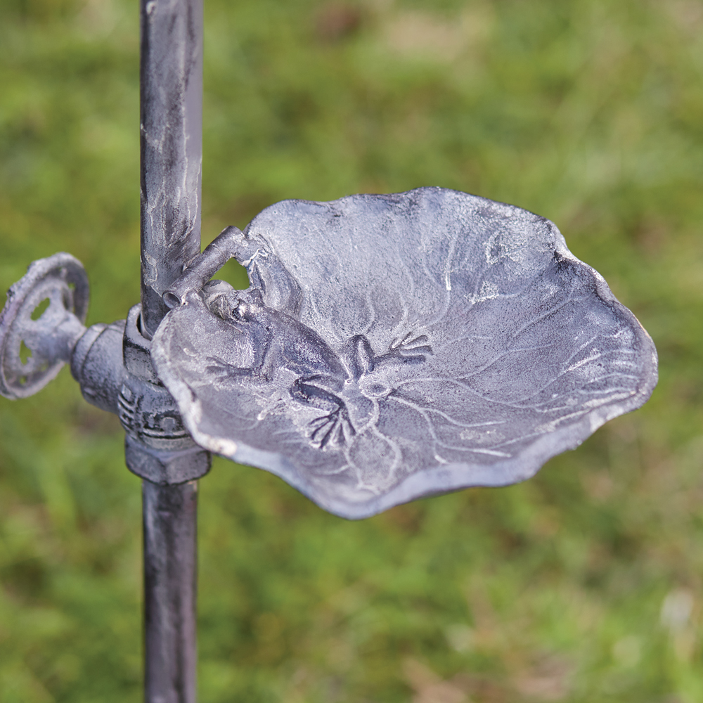 Our Spigot Garden Stake features a birdseed dish that is shaped as a lily pad with a frog. Lilly pad folds for easy storage. Feature in your garden or a potted plant.